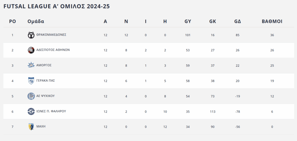 | 13η – 26/01/2025 | ΓΕΡΑΚΑ ΠΑΣ | ΘΡΑΚΟΜΑΚΕΔΟΝΕΣ FUTSAL | 1-4 |
